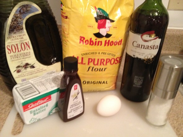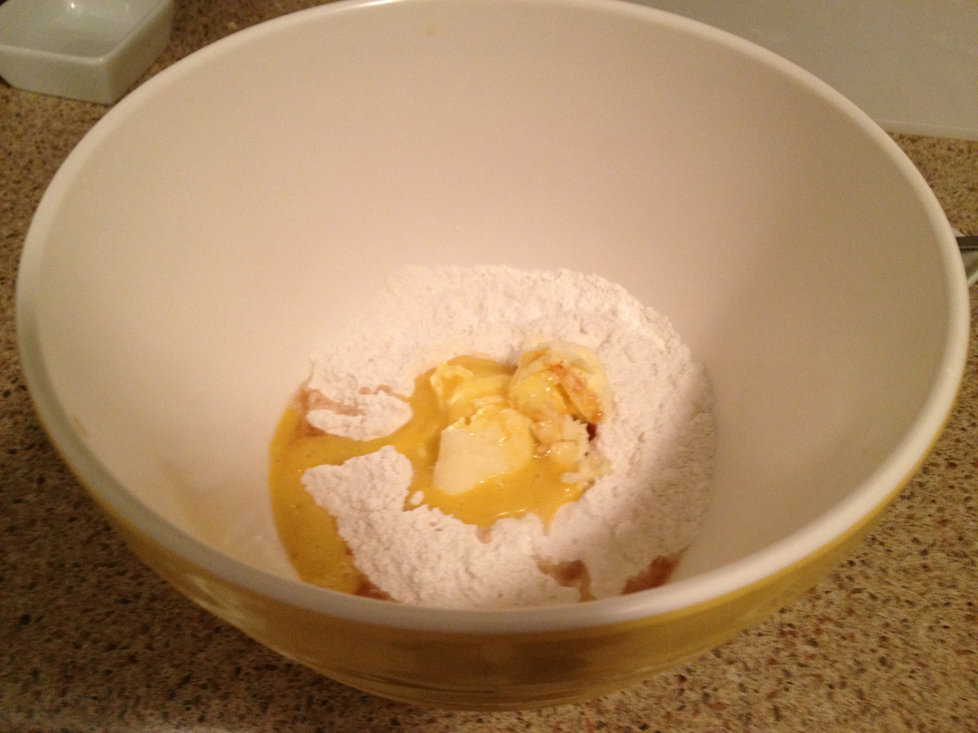 Now that all your ingredients are ready, we’re going to start by making the fried pastry. Place the flour into a bowl and make a small well in the center. Add the cream sherry, butter, vanilla extract, salt and 1 tbs of the beaten egg.