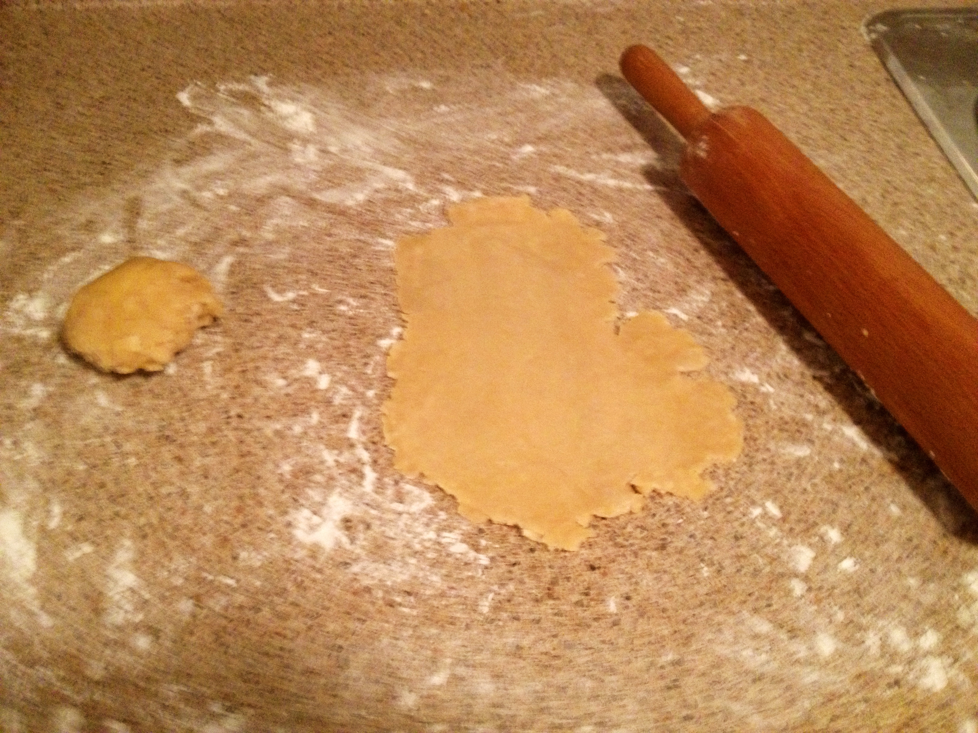 Now that the dough has sat aside for a while, on a lightly floured counter thinly roll out half the dough ball. Using a cookie cutter cut out circles and re-roll the trimmings and continue with the rest of the dough.