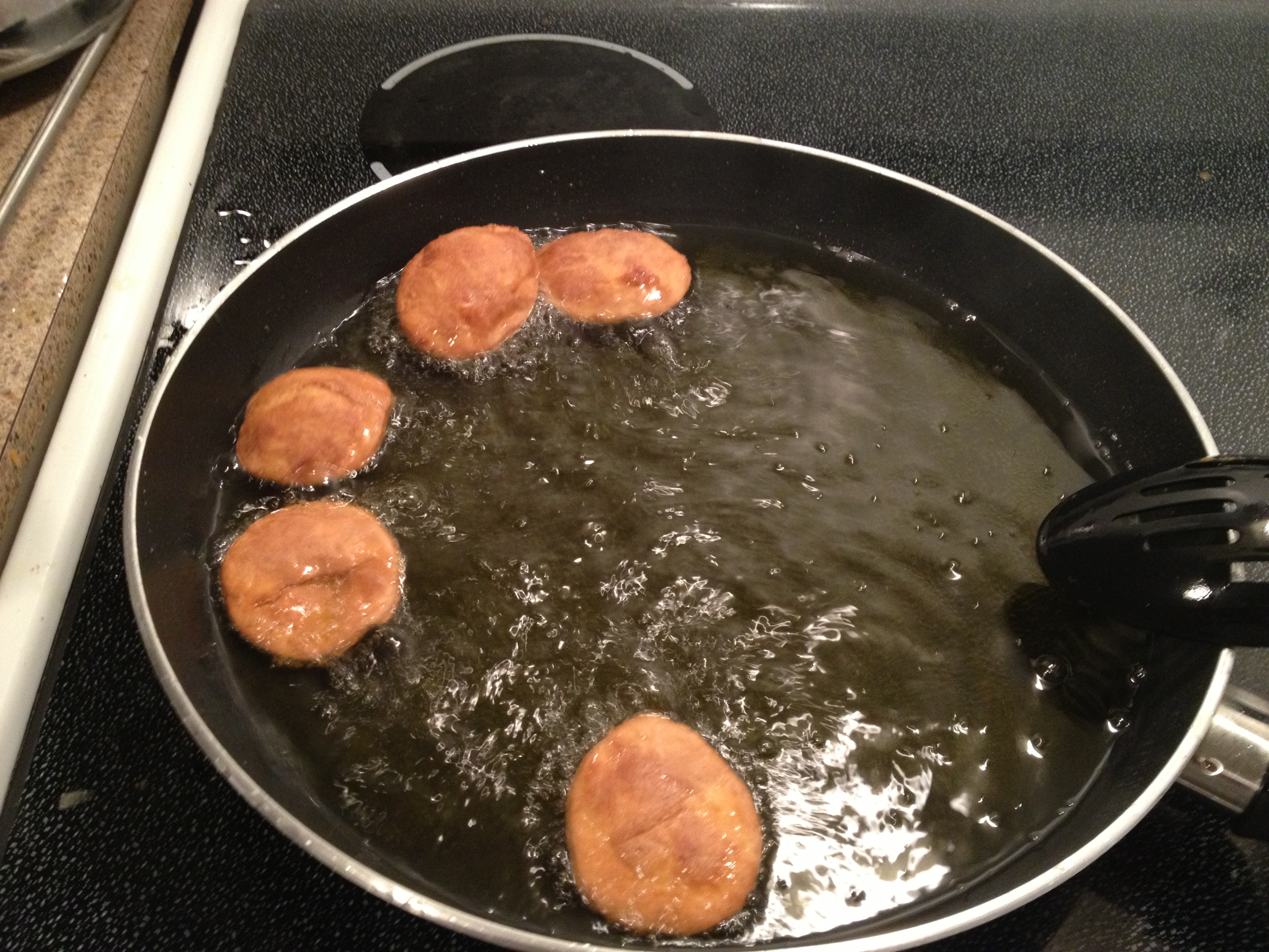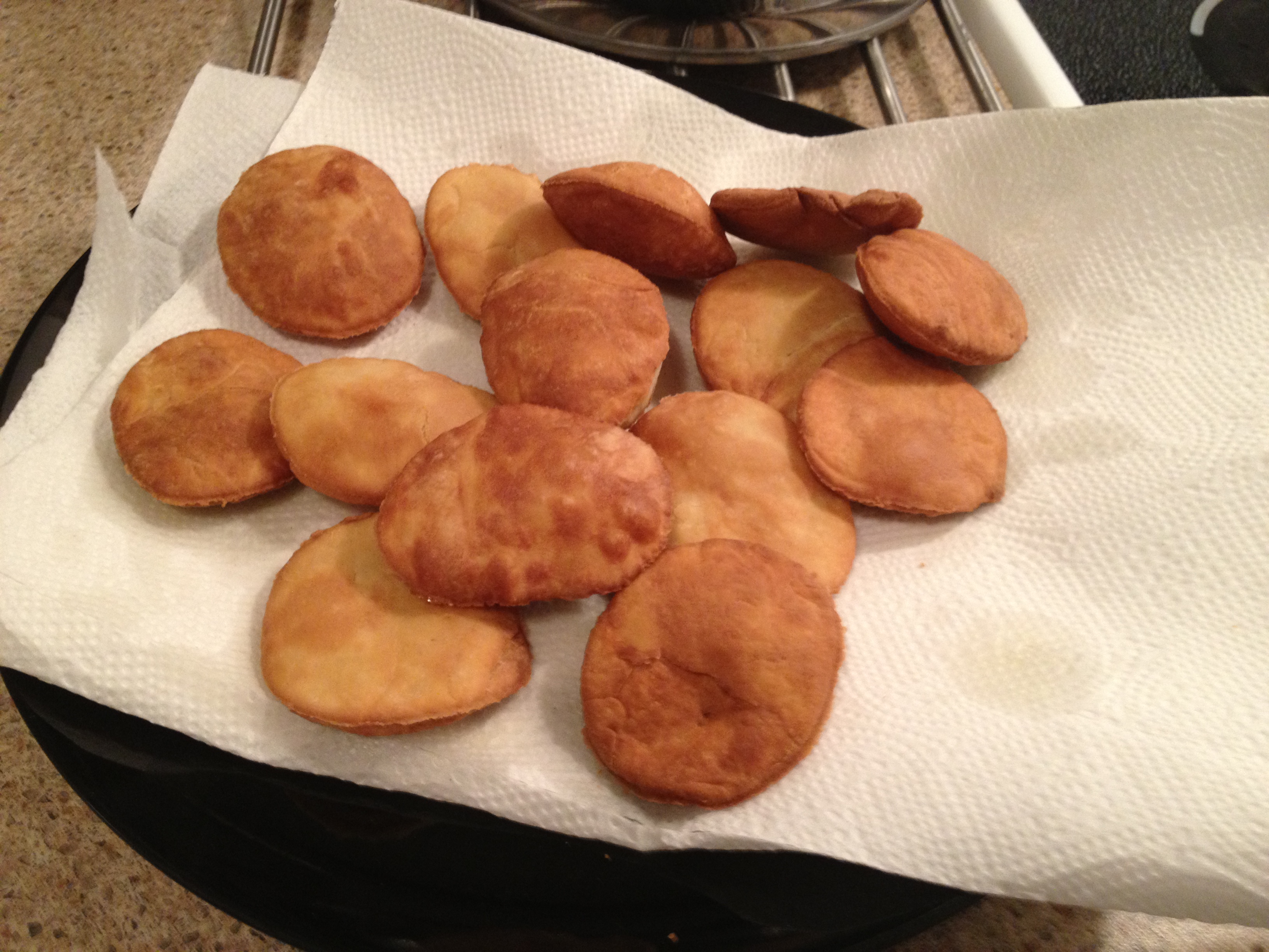 Next heat up the olive oil in a pan. Place 5-6 dough circles into the pan and let them fry for 45 seconds. Using a slotted spoon, turn them over and the circles have puffed up on both side and are golden brown.