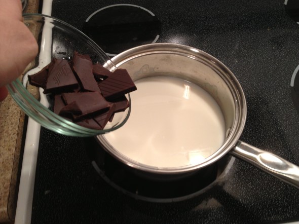 Next we’re going to start working on hot chocolate. In a pot over medium-high heat, stir in the chocolate into the milk. Be sure to keep stirring and add in the sugar.