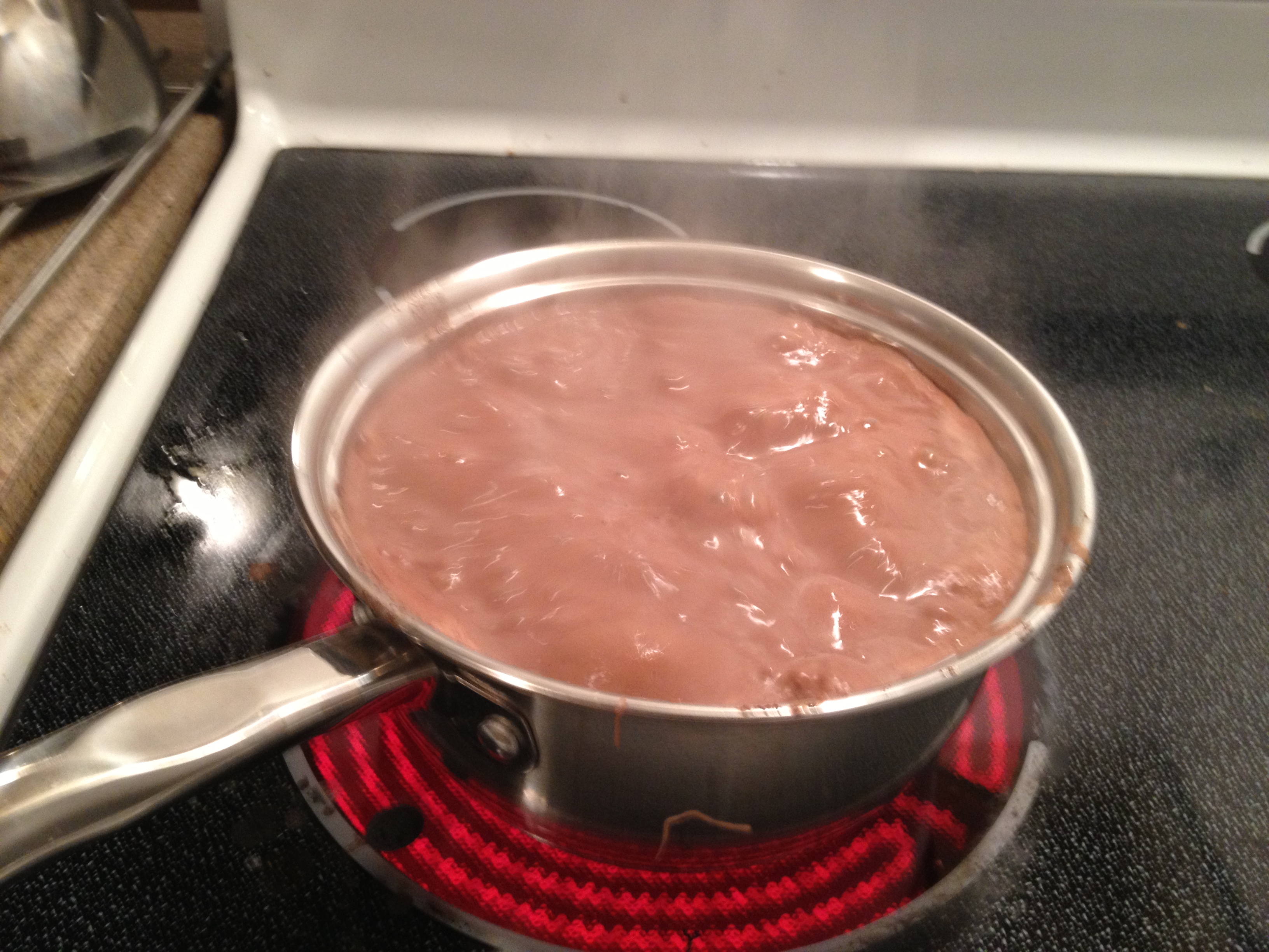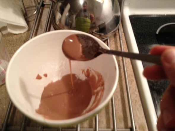 Put the cornstarch nto a small bowl and make a well in the center. Add 2 tbs of the milk-chocolate into the bowl with cornstarch and mix. Once it starts to become pasty, add another 2 tbs of hot milk-chocolate and continue mixing.