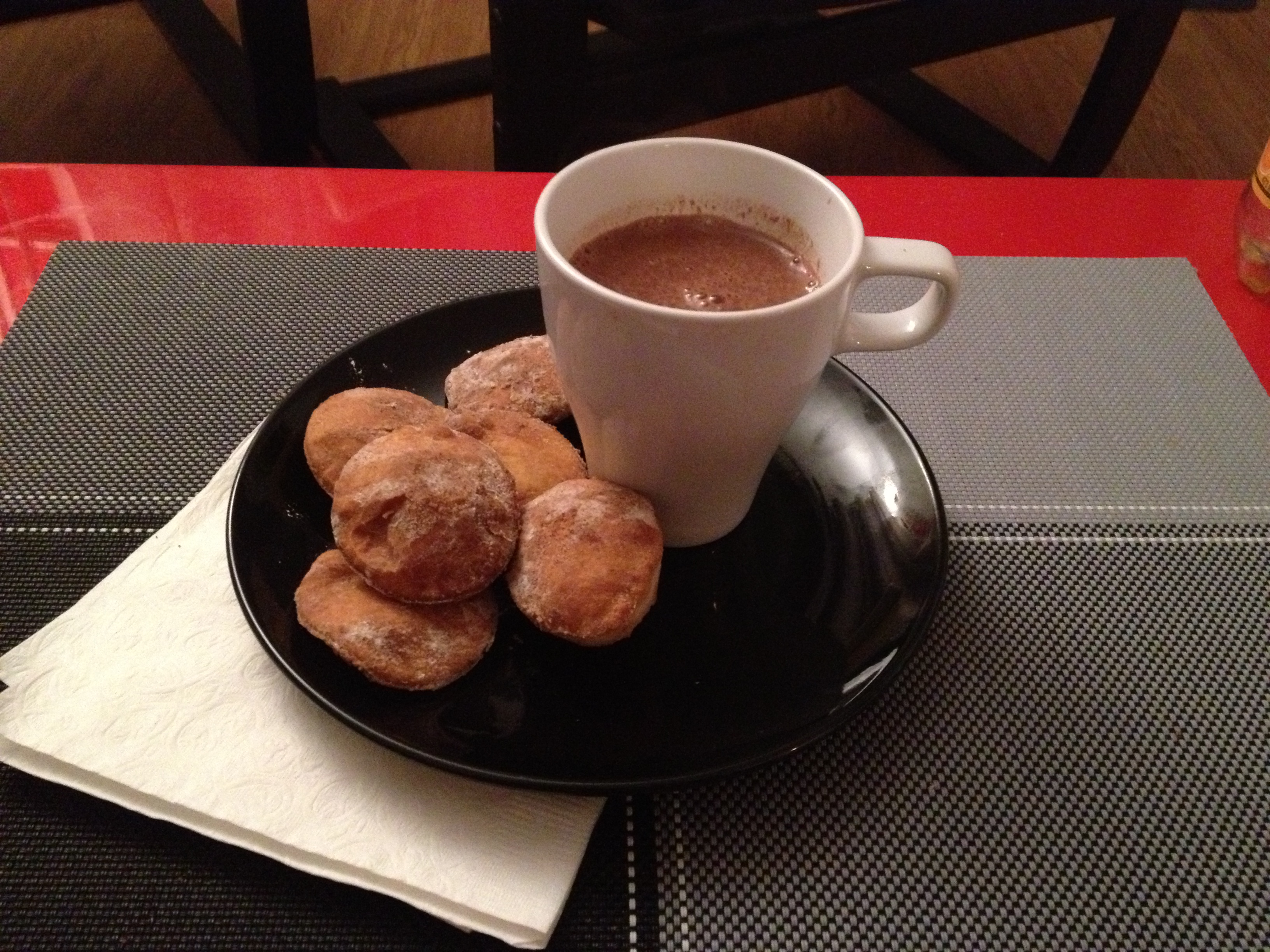 Place a few pastry puffs onto a place and serve alongside the cup of hot chocolate. Enjoy dipping the tasty fried pastry into the chocolate, you’ll be warmed up in no time!