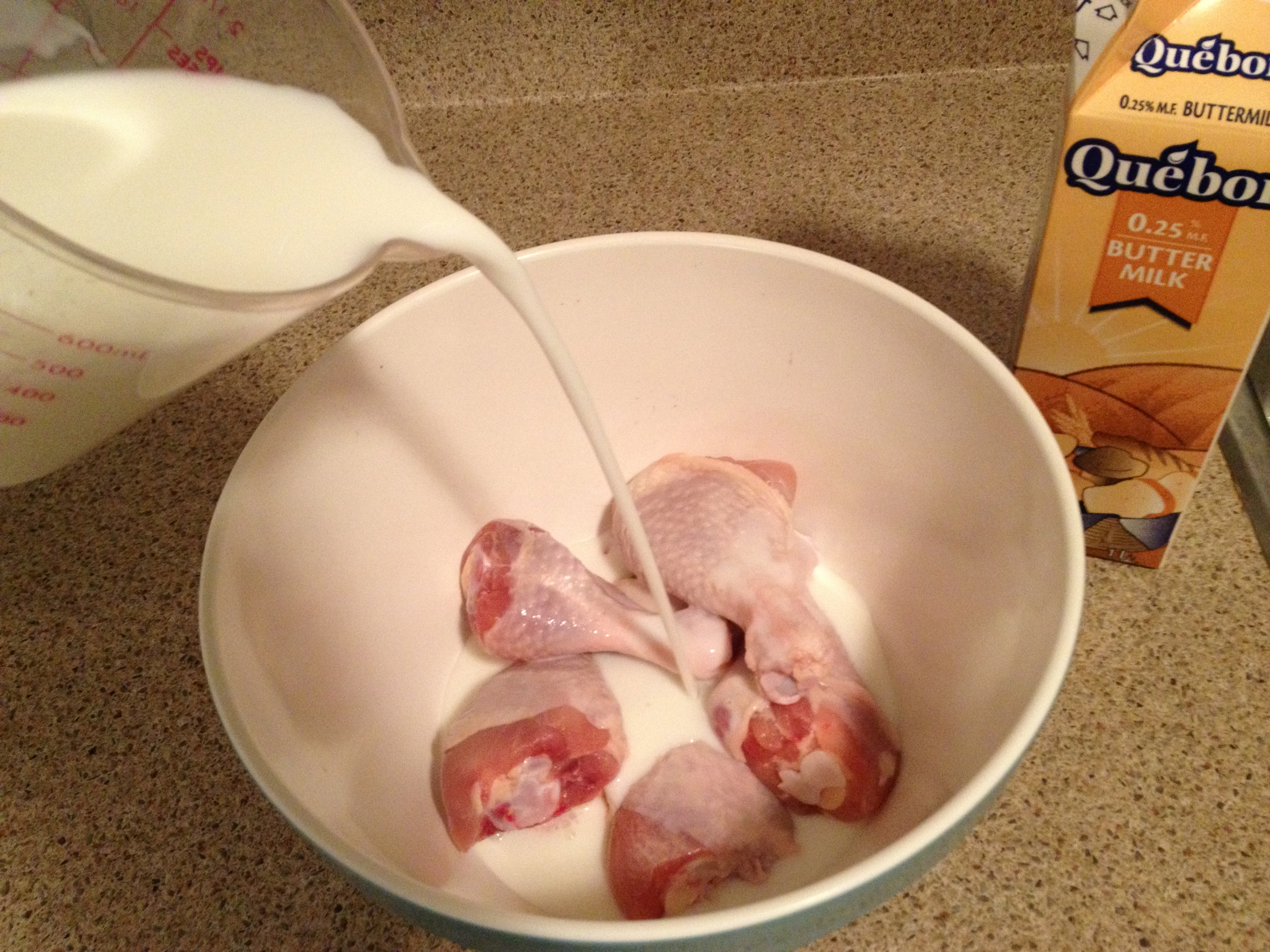 You’ll have to marinate the chicken overnight, so place the chicken into a large bowl and pour in the buttermilk. You’ll want to be sure to completely cover the pieces.
